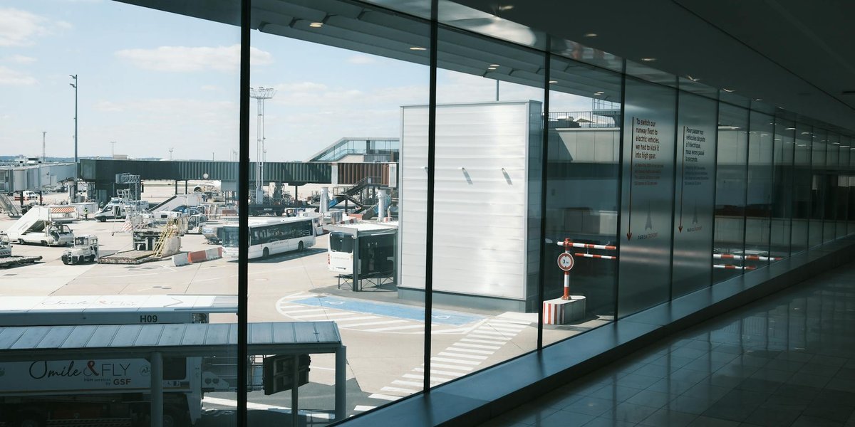 A view through airport windows showing airliners on the runway, creating a travel ambiance.